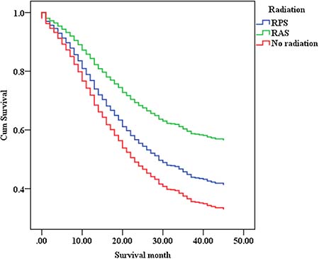 Figure 1: The survival curves of three groups in T-stage subgroups. T2, T3, T4a and T4b subgroup. RPS: patients who underwent radiation after surgery; RAS: patients who underwent radiation prior to surgery; No radiation: patients did not undergo any radiation.