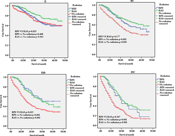 Figure 3: The survival curves of three groups in tumor stage subgroups. II subgroup; IIIA subgroup; IIIB subgroup; IIIC subgroup. RPS: patients who underwent radiation after surgery; RAS: patients who underwent radiation prior to surgery; No radiation: patients did not undergo any radiation.