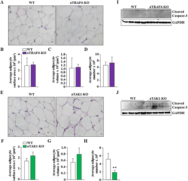 Figure 2: Ablation of TAK1 but not TRAF6 reduces adipocyte survival in eWAT of mice. (A) Representative H&E-stained images of eWAT from 9-week old WT and aTRAF6-KO mice. Scale bars: 20 μm. (B) Average adipocyte surface area, (C) average adipocyte volume, and (D) average adipocyte number in eWAT of WT and aTRAF6-KO mice (n = 3 in each group). (E) Representative H&E-stained images of eWAT from 9-week old WT and aTAK1-KO mice. Scale bars: 20 μm. (F) Average adipocyte surface area, (G) average adipocyte volume, and (H) average adipocyte number in eWAT of WT and aTAK1-KO mice (n = 3 in each group). **p < 0.01 from WT mice by unpaired t-test. (I) eWAT was isolated from WT and aTRAF6-KO mice and the levels of cleaved caspase-3 and unrelated protein GAPDH were measured by performing Western blot (n = 4 in each group). (J) Levels of cleaved caspase-3 and unrelated protein GAPDH in eWAT from WT and aTAK1-KO mice (n = 4 in each group).