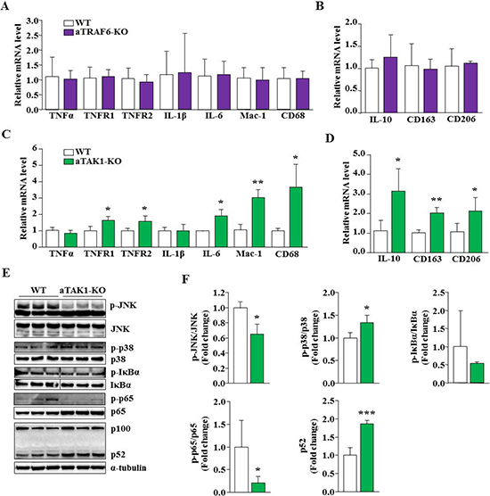 Figure 3: Effect of targeted ablation of TRAF6 and TAK1 on the expression of inflammatory molecules and signaling pathways. (A) eWAT was isolated from 9-week old WT and aTRAF6-KO mice and relative mRNA levels of various inflammatory molecules and M1 macrophages were determined by performing QRT-PCR (n = 3-5 per group). (B) Relative mRNA levels of IL-10 and M2 specific markers in eWAT from WT and aTRAF6-KO mice (n = 3–5 per group). (C) eWAT was isolated from 9-week old WT and aTAK1-KO mice and mRNA levels of various inflammatory molecules and M1 macrophages were determined by QRT-PCR assay (n = 3–4 per group). (D) Relative mRNA levels of IL-10 and M2 macrophage specific markers in eWAT from WT and aTAK1-KO mice (n = 3–4 per group). Protein lysates were prepared from 9-week old eWAT of WT and aTAK1-KO mice, and blotted for specific signaling proteins. (E) Immunoblots, and (F) densitometry quantification of bands are presented here (n = 3 in each group). Vertical black line indicates that intervening lanes were spliced out. *p < 0.05, **p < 0.01, and ***p < 0.001 from corresponding WT mice by unpaired t-test.