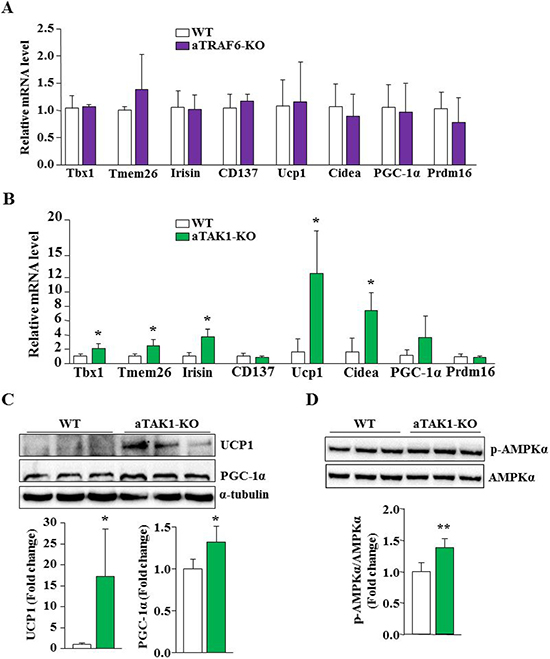 Figure 4: Deletion of TAK1 promotes browning of WAT in mice. (A) eWAT was isolated from 9-week old littermate WT and aTRAF6-KO mice and the relative expression of beige cell markers and brown adipose tissue (BAT) specific genes was determined by QRT-PCR assay (n = 3–5 per group). (B) eWAT was isolated from 9-week old WT and aTAK1-KO mice and the relative expression of beige cell markers and BAT specific genes was determined by QRT-PCR assay (n = 3–4 per group). eWAT was isolated from 9-week old WT and aTAK1-KO mice and the levels of UCP1, PGC-1α and unrelated protein α-tubulin were measured by performing Western blot. (C) Representative immunoblots for UCP1 and PGC-1α and densitometry quantification of bands are presented here (n = 4 in each group). (D) Levels of phosphorylated and total AMPKα protein in eWAT from WT and aTAK1-KO mice (n = 4 in each group). *p < 0.05, and **p < 0.01, from corresponding WT mice by unpaired t-test.