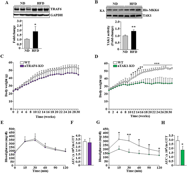 Figure 5: Effect of adipocyte-specific ablation of TRAF6 and TAK1 on HFD-induced obesity. eWAT was isolated from mice fed with normal diet/chow (ND) and HFD and the levels of TRAF6 and unrelated protein GAPDH were measured by performing Western blot. (A) Representative immunoblots and densitometry analysis of bands are presented here. (B) Enzymatic activity of TAK1 in eWAT of ND or HFD-fed mice (n = 3 in each group for A and B). *p < 0.05 from WT mice fed with ND by unpaired t-test. (C) Growth curve of WT and aTRAF6-KO mice fed with HFD (n = 4–5 per group). (D) Growth curve of WT and aTAK1-KO mice fed with HFD (n = 3–6 per group). (E) Blood glucose levels at indicated time points after intraperitoneal injection of glucose in glucose tolerance test (GTT) and (F) area under the curve (AUC) assessment for GTT (n = 4–5 per group) in WT and aTRAF6-KO mice fed with HFD for 30 weeks. (G) Blood glucose levels at indicated time points after intraperitoneal injection of glucose in GTT, and (H) AUC assessment for GTT in WT and aTAK1-KO mice fed with HFD for 30 weeks (n = 3–6 per group). *p < 0.05 and **p < 0.01 from WT mice by unpaired t-test.