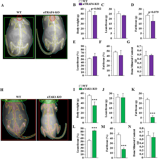 Figure 6: Analysis of body composition of aTRAF6-KO mice and aTAK1-KO mice fed with HFD. (A) Representative DEXA images of WT and aTRAF6-KO mice fed with HFD for 30 weeks. (B) Average body weight of WT and aTRAF6-KO mice fed with HFD (n = 4–5 per group). Quantitative estimation of (C) lean tissue mass, (D) fat tissue mass, (E) percentage of body lean tissue, (F) percentage of body fat tissue, and (G) bone mineral content evaluated by whole body DEXA analysis of WT and aTRAF6-KO mice fed with HFD (n = 4-5 per group). (H) Representative DEXA images of WT and aTAK1-KO mice fed with HFD for 30 weeks. (I) Average body weight of WT and aTAK1-KO mice fed with HFD (n = 3–6 per group). Quantitative estimation of (J) lean tissue mass, (K) fat tissue mass, (L) percentage of body lean tissue, (M) percentage of body fat tissue, and (N) bone mineral content of WT and aTAK1-KO mice fed with HFD (n = 3–6 per group). ***p < 0.001 from corresponding WT mice by unpaired t-test.