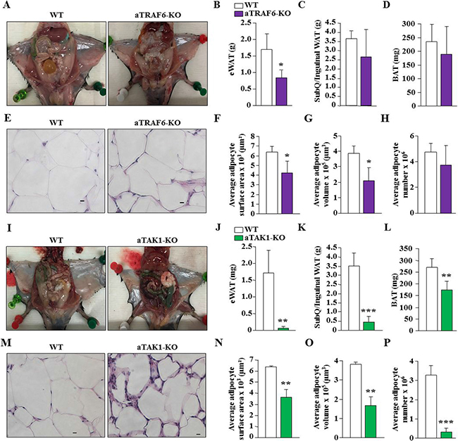 We also investigated whether there was any difference in wet weight of individual WAT and BAT depots, size, and number of adipocytes in aTRAF6-KO mice and aTAK1-KO mice compared to their WT mice after 30 weeks on HFD. Interestingly, eWAT appeared considerably smaller in aTRAF6-KO mice compared to littermate control mice (Figure 8A). Quantitative estimation also showed that eWAT weight was significantly reduced, whereas SubQ/inguinal WAT and interscapular BAT weights were unaffected in aTRAF6-KO mice compared with littermate WT mice (Figure 8B–8D). We next performed H&E staining of eWAT of WT and aTRAF6-KO mice (Figure 8E) and quantified adipocyte surface area, volume, and number of adipocytes. There was a significant decrease in the surface area and volume of adipocytes in eWAT of aTRAF6-KO mice compared with WT mice (Figure 8F, 8G). However, the number of adipocytes remained comparable between eWAT of WT and aTRAF6-KO mice after 30 weeks on HFD (Figure 8H). In comparison to aTRAF6-KO mice, we found that wet weights of epididymal and SubQ/inguinal WAT as well as interscapular BAT were significantly reduced in aTAK1-KO mice compared with their corresponding WT mice fed with HFD (Figure 8I–8L). H&E staining and morphometric analysis showed that adipocyte surface area and volume and the number of adipocytes were significantly reduced in eWAT of aTAK1-KO mice compared with WT mice (Figure 8M–8P). Collectively, these results suggest that while deletion of TRAF6 has a lessened impact in reducing obesity, TAK1 drastically reduces HFD-induced increase in adipose tissue mass, potentially through reducing adipocyte hypertrophy and survival.