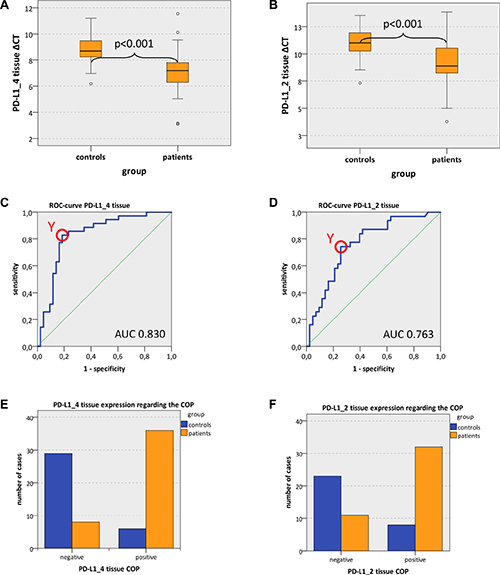 Data were derived from RT-qPCR and are presented as ΔCT values. PD-L1 expression in tissue samples was normally distributed. Shapiro-Wilk testing revealed a p-value of 0.365 for PD-L1_4 and 0.177 for PD-L1_2 in tissue specimens. In blood samples, PD-L1 expression was not normally distributed. Shapiro-Wilk testing revealed p-values < 0.001 for both PD-L1_4 and PD-L1_2 in blood samples. Using the Mann-Whitney U test, OSCC patients (group patients) and healthy controls (group controls) were tested for significant differences of mRNA expression for the transcript variants 1, 2 and 4 of PD-L1. In the analyses, expression of two isoforms of the gene was analyzed simultaneously (PD-L1 variants 1 and 2 named PD-L1_2 and PD-L1variants 1 and 4 named PD-L1_4) (Table 2). Higher ΔCT values indicate lower mRNA expression (Table 3).