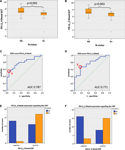 In order to confirm the statistical relevance, ROC curves (Figure 2C and 2D) were generated and the AUC was determined. Upregulated PD-L1_4 mRNA yielded an AUC of 0.79 (Table 4, Figure 2C) and upregulated PD-L1_2 mRNA reached an AUC of 0.77 (Table 4, Figure 2D). Thus, this analysis confirmed that both PD-L1 mRNA variants were of significant diagnostic value for discrimination of N+ and N0 OSCC patients using peripheral blood samples. The results showed a statistically significant association between PD-L1 overexpression and the prevalence of lymph node metastases (N+).