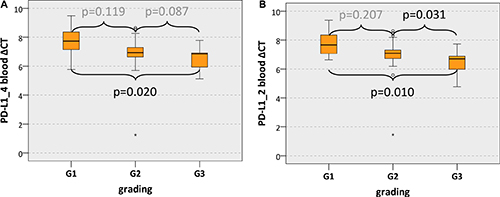 Figure 3: PD-L1 blood expression in OSCC patients depending on the grading Box plots of the median PD-L1 expression rates in peripheral blood of OSCC patients depending on the tumor grading (G1-G3). The median ΔCT values of PD-L1 splicing variants 1 and 4 (PD-L1_4) (Figure 3A) and splicing variants 1 and 2 (PD-L1_2) (Figure 3B) derived from RT-qPCR are given. Higher ΔCT values indicate lower PD-L1 mRNA expression. The median, the interquartile range and the standard deviation are provided. Statistical analyses were carried out by the Mann-Whitney U test.