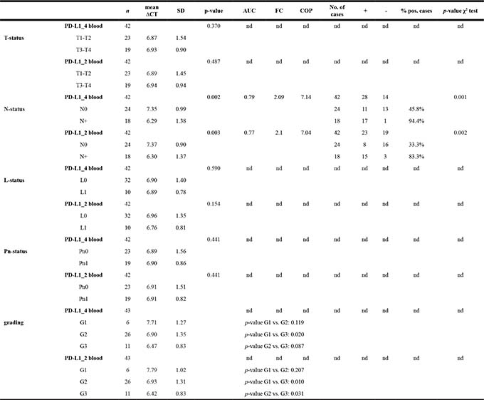 There was no significant association between the altered blood expression of PD-L1 mRNA and tumor size (T1/T2 vs. T3/T4) (p > 0.05). Moreover, no significance was shown with regard to changes in blood expression rates of PD-L1 mRNA and histologically proven lymph vessel infiltration (L-status) or perineural infiltration (Pn-status). The results of statistical assessment are summarized in Table 4.