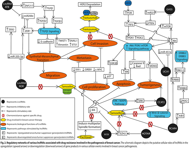 Figure 2: Regulatory networks of various lncRNAs associated with drug resistance involved in the pathogenesis of breast cancer. The schematic diagram depicts the putative cellular roles of lncRNAs in the upregulation (upward arrows) or downregulation (downward arrows) of gene products in various cellular events involved in breast cancer pathogenesis.
