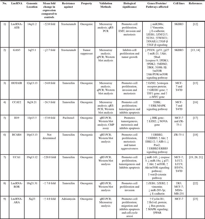 Table 1: Breast cancer-associated long non-coding RNAs, their reported biological functions in drug resistance and the affected pathways