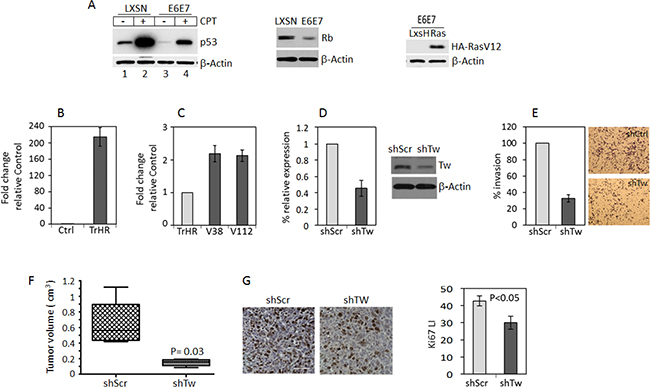 Figure 1: TW knockdown in HPV E6/7 transformed neural progenitor cells (NPCs) inhibits tumorigenicity. (A) Protein expression of p53, Rb and HA-RasV12 in control and HPV E6E7 HA-RasV12 transformed NPCs. With constitutive expression of E6E7, expression and induction of p53 expression by CPT is reduced (left panel) and Rb expression is decreased (middle panel). The levels of HA-RasV12 expression are shown (right panel). (B) Quantification of TW mRNA after transformation of 3 month old mouse forebrain NPCs with HPV/Ras (TrHR) vs NPC transduced with empty vectors. (C) Cells isolated from HPV/Ras generated gliomas (V38 and V112) propagated in vitro show a modest 2-fold increase in TW expression compared with the parental cells (TrHR) prior to implantation. (D) shRNA specific for TW (shTw) produced a 60% knockdown of TW mRNA expression in V38 cells. Corresponding TW protein expression levels measured by Western Blot are shown (right). (E) Invasion of V38 cells after TW knockdown quantified in a matrigel invasion assay. (F) Equal numbers of V38 control and shTW cells were injected orthotopically and tumor volumes were quantified at 40 days post-injection. (G) Representative Ki-67 immunohistochemistry of glioma sections from control (left panel) and shTW (right panel) generated tumors. Scale bar, 30 μm. Quantification of Ki-67 labeling indices form randomly selected fields shows a significant decrease in proliferation of shTW tumors (p = 0.03).