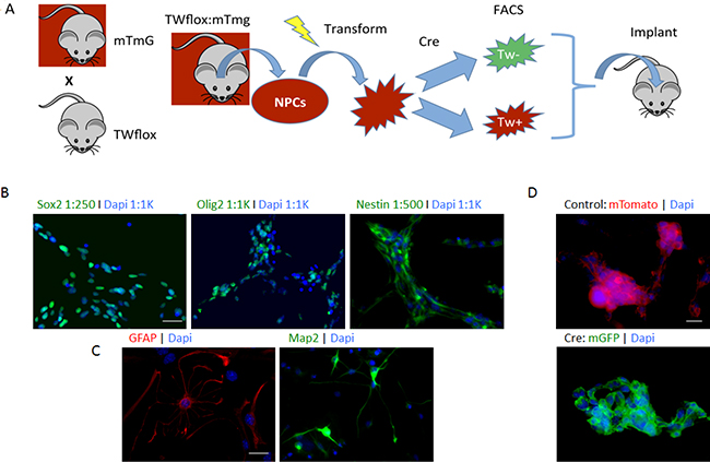 Figure 2: Floxed TW mouse glioma model. (A) Scheme used to investigate TW function in TWflox:mTmG transgenic mice. (B) Immunophentyping of NPCs prior to transformation showing expression of neural stem and progenitor markers Sox2, Olig2 and nestin. Scale bar, 30 μm. (C) NPCs are multi-potent expressing astrocytic (GFAP) and neuronal (Map2) markers after exposure to differentiating conditions. Scale bar, 20 μm. (D) Conversion of mTmG Cre reporter after exposure to Cre recombinase. Scale bar, 10 μm.