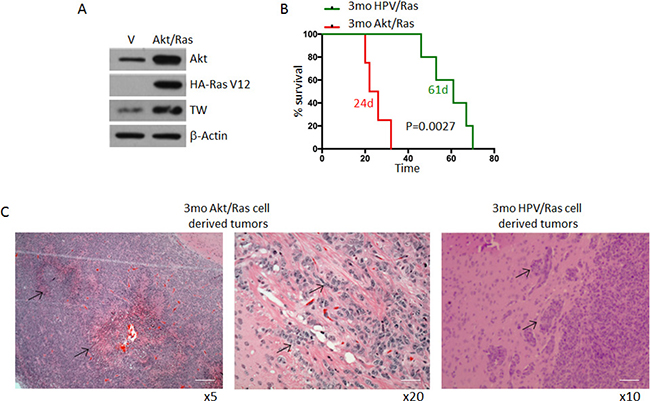 Figure 3: Comparative survival of 3mo mouse NPCs transformed by HPV/Ras versus Akt/Ras. (A) Transformation of NPCs with Akt/Ras resulted in upregulation of TW compared with NPCs transfected with empty vectors as control. (B) Median survival of animals implanted with equal numbers of HPV/Ras (61 days) and Akt/Ras (24 days) (p = 0.0014). (C) Representative histology from Akt/Ras cells showing marked pseudo-palisading necrosis (left image, arrows). Higher magnification demonstrates invasive cells in white matter. Scale bar, 100 μm (left), 25 μm. HPV/Ras tumors demonstrated local invasion only (arrows) without necrosis Scale bar, 50 μm.