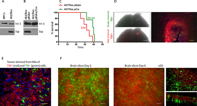 Figure 4: Outgrowth of TW+ cells after implantation of unsorted Akt/Ras NPCs infected with Cre recopmbinase. (A) Western blot of NPCs co-expressing Akt/Ras upregulate TW expression. (B) After stable infection with Cre recombinase green conversion was >98% (not shown) and no TW protein was detected by western blot. (C) Survival of animals implanted with the Cre infected cells was prolonged (Survival time is shown for each group, p = 0.064). (D) Example of whole brain image of animal brain 10 d after implantation of unsorted primarily green Cre cells. Both green and red channel fluorescence are detected under dissecting microscope. Scale bar, 1 mm. Histologic image (10×) of the same tumor comprised nearly entirely of red TW+ cells (right panel) capable of invading brain tissue. TW null cells are detected in the tumor mass, but no invasion of GFP positive cells is detected. Scale bar, 50 μm. (E) Photomicrograph of tissue section from tumor after 50:50 implantation of TW+ (red) and TW− (green) cells shows nearly complete loss of TW− cells. Scale bar, 20 μm. (F) Temporal changes in cell survival after seeding equal numbers of TW+ (red) and TW− (green) on a postnatal mouse brain section. Serial images of a representative experiment after 2 days in culture (left) and 6 days in culture (right). Representative confocal image of the brain slice after 6 days of culture clearly demonstrate outnumbering of TW+ (red) cells. Scale bar, 30 μm.