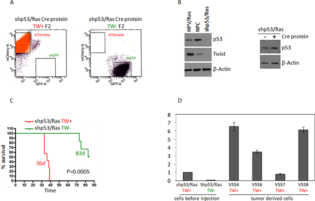 Figure 7: Deletion of TW in shP53/Ras transformed NPCs prolongs survival. (A) FACS enrichment (F2) shows pure populations of mTomato (TW+) and GFP (TW−) cells. (B) Levels of p53 expression in cells transformed with shp53/Ras compared to normal NPCs and cells transformed with HPV/Ras. Ha-RasV12 expression not shown. Levels of TW in shp53/Ras cells is below detection limit on the Western blot compared to normal NPCs or HPV/Ras transformed cells. After Cre mediated TW deletion levels of p53 expression are not changed. TW deletion is confirmed by fluorescence conversion and qRT-PCR (shown in panel D) (C) Deletion of TW prolongs survival of hosts implanted with shP53/Ras transformed NPCs. Tumors were verified for fluorescence corresponding to TW genotype. No contamination was found in TW null (green) tumors. Animals sacrificed without clinical manifestation demonstrated surviving TW– cells/small tumor at injection site (Supplementary Figure 2). (D) TW mRNA expression in shP53/Ras Cre cells derived from tumor showing increased TW expression after growth in vivo.