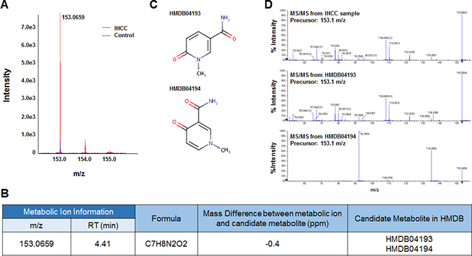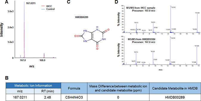 Figure 4: Identification of a metabolic ion of m/z 167.0211 m/z with an RT of 2.48 min. (A) MS spectrum of the 167.0211 m/z in the negative detection mode. The intensity of the ion was slightly less in serum from IHCC patients (red peaks) compared to controls (blue peaks). (B) The candidate HDMB metabolite giving rise to the ion of 167.0211 m/z. Only one candidate was identified: HMDB00289 (uric acid). (C) Structure of the candidate metabolite. (D) The MS/MS patterns of the 167.0211 m/z from IHCC sera and uric acid. The patterns were identical.