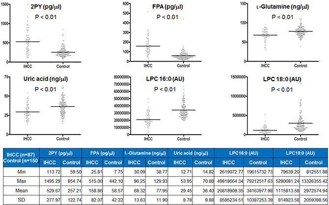 Quantification of the six differentially expressed metabolites in the serum from IHCC patients