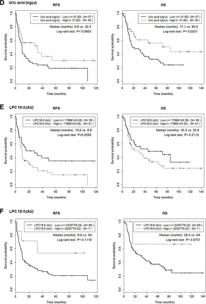 Figure 6: Lower 2PY and LPC16 levels were associated with better RFS. Cutoffs for maximal prediction of high/low level RFSs were determined (Table 3). The Figure shows the associations between RFS or overall survival (OS) with the levels of the six metabolites, 2PY (A), FPA (B), L-glutamine (C), uric acid (D), LPC 16:0 (E) and LPC 18:0 (F). 2PY and LPC 16:0 showed significantly better RFS at low level than high level (p = 0.037 and p = 0.035, respectively). In addition, high-level L-glutamine was associated with a better OS (p = 0.0121).