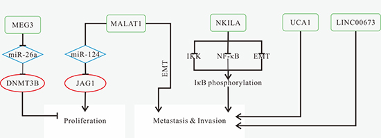 Figure 4: Mechanisms of lncRNAs in TSCC progression. (A) down-regulated MEG3 results in miR-26a overexpression, and then reduce DNMT3B expression, thus promoting cell proliferation and inhibiting apoptosis; (B) MALAT1 overexpression promotes tumor growth and invasion by increasing JAG1 expression resulted from the reduction of miR-124; induces EMT; (C) down-regulated NKILA promotes tumor cell migration and invasion via promoting IκBα phosphorylation induced by IKK, NF-κB activation and the induction of EMT process; (D) UCA1 promotes migration; (E) LINC00673 promotes migration and invasion.