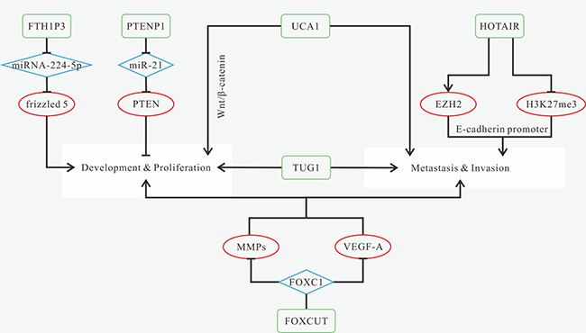 FOXC1 upstream transcript (FOXCUT), a novel lncRNA associated with tumorigenesis, is transcribed from the upstream region of FOXC1 promoter. Studies have demonstrated that FOXC1 is a cancer-associated gene and its overexpression contributes to poor survival in the patients with breast cancer, OSCC, hepatocellular carcinoma, and so on [156–158]. Recently, the "lncRNA-mRNA pair" formed by lncRNA FOXCUT and mRNA FOXC1, has been verified to play a significant role in tumor progression. FOXC1 expression is positively correlated with FOXCUT’s in OSCC, and both of them are over-expressed in OSCC patients [157]. Knockdown of either FOXC1 or FOXCUT can remarkably inhibit cell proliferation, migration and invasion, and also reduce the expression levels of matrix metalloproteinases (MMPs) and VEGF-A [157].