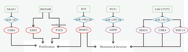 ANRIL (antisense noncoding RNA in the INK4 locus), is a long noncoding RNA spanning 126.3kb at the antisense orientation of the INK4B-ARF-INK4A gene cluster, whose spliced product is a 3834bp RNA consisting of 19 exons. ANRIL has been reported to be related to epigenetic transcriptional repression of the INK4 locus through the interactions between Chromobox 7 (CBX7) and ANRIL [82]. Accumulating evidence has proved that ANRIL has the oncogenic ability to induce NPC. Highly expressed ANRIL could enhance cell proliferative and transforming capacity, as well as increase the proportion of side population cells (SP cells) in NPC [83]. ANRIL could also reprogram glucose metabolism for energy provision of cell proliferation. ANRIL-mediated up-regulation of Glut1 and LDHA, associated with the regulation of basal uptake of glucose and aerobic glycolysis, respectively, can enhance glucose uptake for rapid ATP production in NPC cells. We infer that ANRIL might activate the mTOR signal pathway via promoting the phosphorylation of Akt, and thus influences the expression of essential genes in glycolysis [83]. Additionally, miRNA let-7a is down-regulated in NPC tissues and negatively correlated with ANRIL expression. ANRIL knockdown might reduce carcinogenic ability and increase DDP-induced cytotoxicity by increasing miR-let-7a expression in NPC [84].