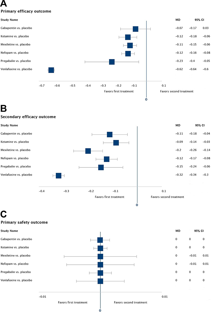 Figure 2: Pairwise meta-analyses for all outcomes. Forest plots of the mean differences (MDs) and associated 95% confidence intervals (95% CIs) comparing each treatment against placebo for (A) the primary efficacy outcome, (B) the secondary efficacy outcome, and (C) the primary safety outcome.