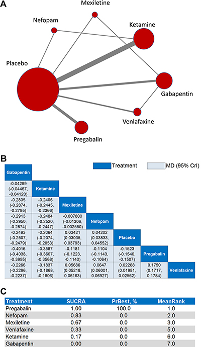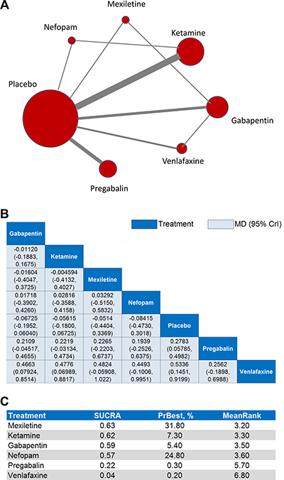 The results of the pairwise meta-analysis for the primary efficacy outcome revealed that all six interventions (with the notable exception of gabapentin) were significantly superior to placebo in reducing pain (p < 0.05, Figure 2A, Supplementary Information, Supplementary Table 3). The results of the primary efficacy network meta-analysis — network plot (Figure 3A), MD point estimates and associated 95% CrIs (Figure 3B), and SUCRA rankings revealed that mexiletine ranked highest, followed by ketamine and gabapentin, respectively (Figure 3C, Supplementary Information, Supplementary Table 5, Supplementary Figure 1).