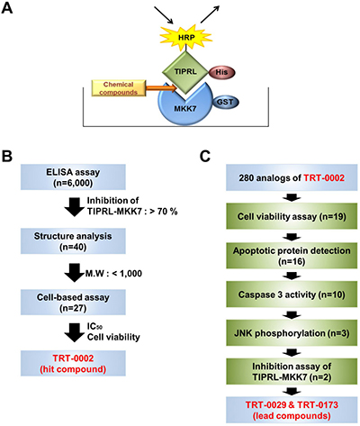 Figure 1: Strategies used to screen for chemical compounds that enhance TRAIL-induced apoptosis by inhibiting MKK7-TIPRL interaction. (A) Schematic of an ELISA system designed to identify chemical compounds that inhibit the MKK7-TIPRL interaction. (B) Flowchart for the selection of the hit chemical compound, TRT-0002, from over 6,000 chemical compounds. (C) Flowchart for the selection of the lead compounds, TRT-0029 and TRT-0173, from 280 analogs of TRT-0002.