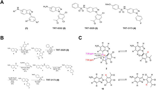 TRT-0029 and TRT-0173 were synthesized as shown in Figure 2B and 2C. The arylation of 5-amino-1H-indazole (5) with 1-acetyl-2, 4-dichloro-5-fluorobenzene under basic conditions (K2CO3, DMF, 110°C) yielded the intermediate 2. Compound 2 was sulfonylated with benzenesulfonyl chloride under standard conditions to afford TRT-0029 (Figure 2A). The condensation reaction of 2-fluoro-5-nitrobenzaldehyde (6) with 4-fluorophenylhydrazine in the presence of toluenesulfonic acid resulted in the formation of the hydrazone 7, which was then cyclized in the presence of potassium carbonate to give the 5-nitro-1H-indazole 8. The nitro reduction of compound 8 and subsequent sulfonylation with 4-methoxybenzenesulfonyl chloride yielded TRT-0173 (Figure 2B lower). The structure of intermediate 2 was discriminated from its 2-aryl-2H-indazole regioisomer 10 based on heteronuclear multiple bond correlation (HMBC) and nuclear Overhauser effect (NOE) experiments, as shown in Figure 2C. Briefly, the structures were identified as follows. The singlet proton at 7.94 ppm was assigned at the position 6 of the 5-acetyl-2,4-dichlorophenyl moiety because it correlated with the acetyl carbonyl carbon at 198.6 ppm in the HMBC spectrum. The proton exhibited 0.3% NOE on a doublet proton at 7.09 ppm, which was assigned at position 7 of the indazole core structure. Structure 10, a regioisomer of 2, would exhibit different behavior in the NOE experiment.