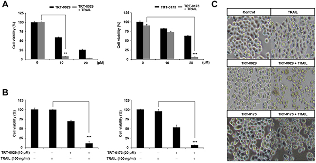 Figure 3: Lead compounds (TRT-0029 or TRT-0173) sensitize Huh7 cells to TRAIL-induced cell death. (A) Huh7 cells were treated with various concentrations of lead compounds (TRT-0029 or TRT-0173) in the absence or presence of TRAIL (100 ng/ml) for 24 h, and an MTT assay was then performed. Differences in the viabilities of treated cells were assessed using Student’s t-test (**p < 0.01, ***p < 0.001) (B) MTT assay for the viability of Huh7 cells treated with TRAIL alone, lead compound alone, and a combination of TRAIL and lead compound for 24 h. (***p < 0.001). (C) Morphologies characteristic of cell death were observed with a microscope. Pictures were taken at a magnification of ×100.