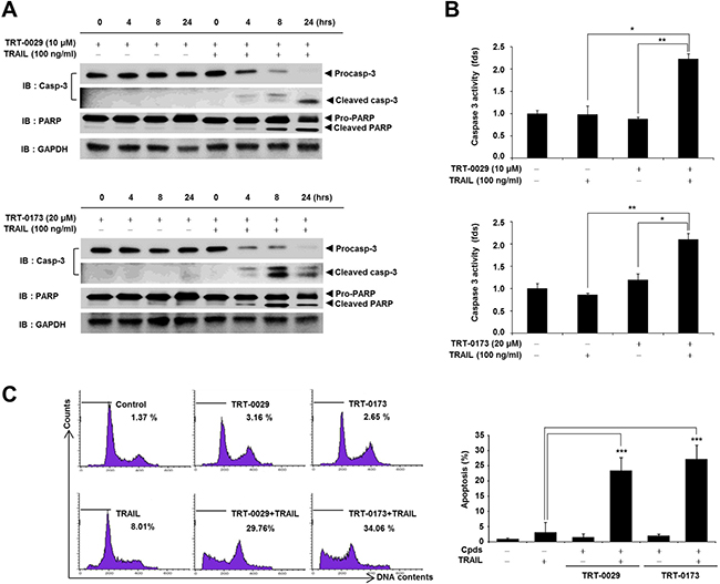 Figure 4: Lead compounds induce TRAIL-mediated apoptosis via caspase signals in Huh7 cells. (A) Huh7 cells were treated with lead compound (10 μM for TRT-0029 and 20 μM for TRT-0173) in the presence or absence of 100 ng/ml TRAIL for the indicated time periods. The PARP and caspase-3 levels were examined by Western blotting. GAPDH was used as a loading control. (B) Huh7 cells were treated with lead compound (10 μM for TRT-0029 and 20 μM for TRT-0173) and TRAIL for 24 h. The cells were analyzed for caspase-3 activity and differences in this activity were assessed using Student’s t-test (*p < 0.05, **p < 0.01) (C) Cell cycle analysis of propidium iodide-stained Huh7 cells was performed using flow cytometry (left). The bars indicate the percentages of cells in the sub-G1 phase based on apoptosis signals. Bar graphs represent the percentages of sub-G1 DNA contents undergoing apoptosis (***p < 0.001) (right).