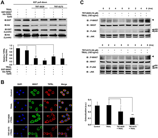 Figure 5: Effects of inhibition of MKK7-TIPRL interaction and activation of MKK7/JNK by the lead compounds. (A) GST pull-down assay. 293T cells were co-transfected with GST-MKK7 and HA-TIPRL vectors for 24 h and then treated with lead compound (10 μM for TRT-0029 and 20 μM for TRT-0173) and/or TRAIL for 24 h (upper). The signal intensity corresponding to HA-TIPRL/GST-MKK7 was quantified by the ImageJ program, and differences in this activity were assessed using Student’s t-test (*p < 0.05, **p < 0.01) (lower) (B) Huh7 cells were treated with lead compound (10 μM for TRT-0029 and 20 μM for TRT-0173) in the presence of TRAIL for 8 h, were stained with antibodies against MKK7 (green) and TIPRL (red), and then observed by confocal microscopy. DAPI (blue) was used for nuclear staining. Scale bar, 50 μm (left). The significance of the differences was assessed with a one-way ANOVA and Bonferroni’s multiple comparison post hoc test (*p < 0.05, ***p < 0.001). Yellow indicates the co-localization of TIPRL (red) and MKK7 (green) (right). a.u., artificial unit. (C) Huh7 cells were treated with lead compound in the presence or absence of 100 ng/ml TRAIL for the indicated time periods. The phosphorylation of MKK7 and JNK was examined by Western blotting.