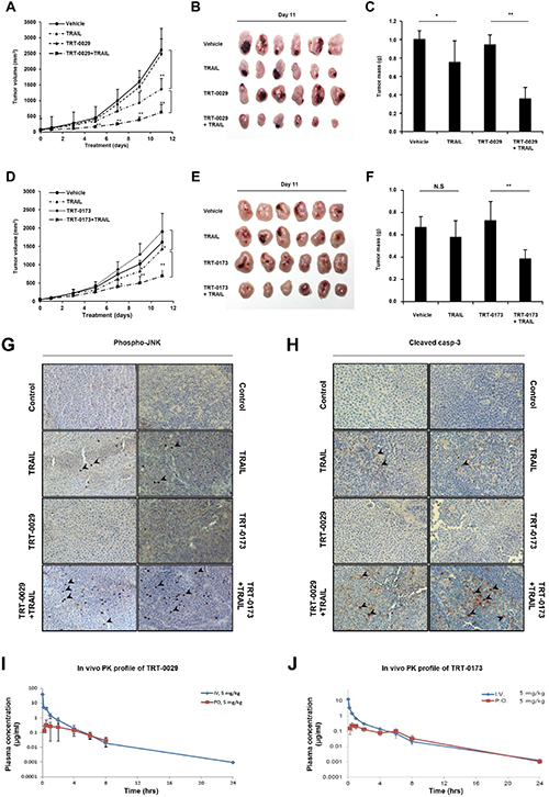 Figure 6: Treatment with lead compounds and TRAIL suppresses the growth of Huh7 tumor xenografts. (A) and (D) Tumor formation was analyzed in an in vivo xenograft model in which Huh7 cells were subcutaneously injected. The nude mice were treated daily with vehicle, TRAIL (2.5 mg/kg, i.p), lead compound (30 mg/kg of TRT-0029: A or TRT-0173: D, i.v.), or lead compound in the presence of TRAIL for 11 days. Tumor volume was measured every other day for 11 days. Each point on the graph represents the average tumor volume ± SD (n = 6/group) (*p < 0.05, **p < 0.01). (B) and (E) On the last day of study, the mice in the indicated groups were euthanized, and the tumors were excised and photographed. (C) and (F) Tumor mass was measured in each group at the time of euthanasia. Values are the means ± SD (*; p < 0.05, **; p < 0.01, ns; non-significant). (G) and (H) Tumor sections from the tumors presented in B and E were stained with antibodies against p-JNK and cleaved caspase-3. The arrowheads indicate positive signals. (I) and (J) The drug plasma concentration was measured over time after i.v. tail vein (5 mg/kg) or oral (5 mg/kg) administration of lead compound (TRT-0029: I or TRT-0173: J).