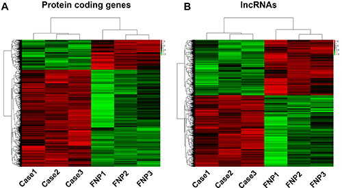 Figure 2: Heat maps of differential expression and hierarchical clustering of (A). Protein coding genes and (B). lncRNAs in chordoma and FNP tissues.