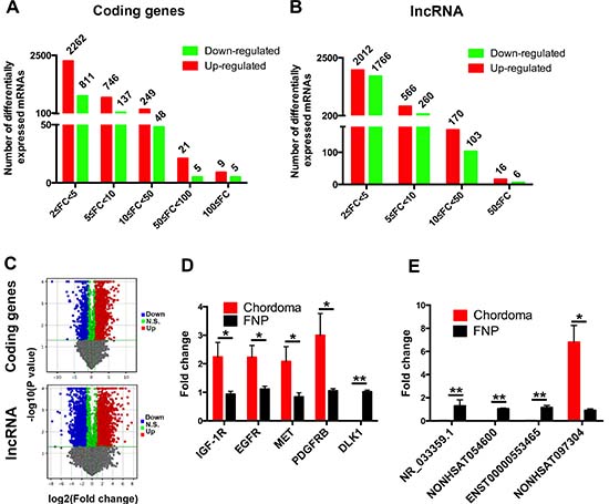 Figure 3: Profile and verification of the differentially expressed mRNAs and lncRNAs. Microarray analysis of the chordoma samples and FNP revealed the number of differentially expressed protein coding genes (A) and lncRNAs (B) with various fold changes. The volcano plots (C) showed the distribution of differentially expressed protein coding genes and lncRNAs identified in chordoma. The protein coding genes or lncRNAs with more than 2 fold change were noted as red dots(positive) and green dots(negative). Randomly selected protein coding genes (D) and lncRNAs (E) were validated by qPCR. (* represents for P value < 0.05, and ** represents for P value < 0.01).