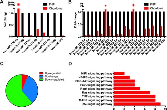 Figure 6: Suppressed expression of the imprinted gene clusters in DLK1-MEG3 region. The chordoma samples were subjected to miRNA microarray analysis. (A, B) Expression of the two major miRNA clusters in DLK1-MEG3 region in chordoma. (C) Percentage of the up-(red) and down-(green) regulated miRNAs in the DLK-MEG3 region in chordoma. (D) KEGG analysis of the genes that correlate with MEG3 and MEG8 were enriched in different signaling pathways.