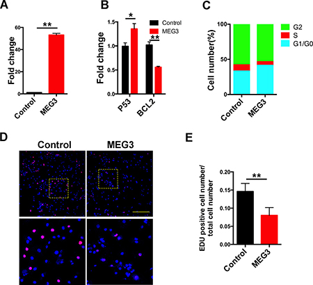 Figure 7: Over-expression of MEG3 suppressed chordoma cells proliferation. The chordoma cells were transfected with pcDNA-MEG3 to elevate MEG3 expression in chordoma cells. qPCR validated that MEG3 expression is significantly up-regulated in chordoma cells (A), and its down-stream targets P53 and Bcl2 were also changed (B, C). Cell cycle analysis showed the chordoma cells were retained in the G1/G0 phase with MEG3 over-expression. (D, E) EdU staining of the chordoma cells showed the decreased proliferation rate in MEG3 over-expression group.(* represents for P value < 0.05, and ** represents for P value < 0.01).
