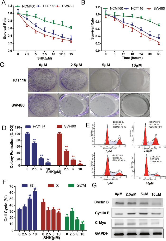 Figure 1: Shikonin suppresses the proliferation of colon cancer cells in vitro. (A) Cells were treated with increasing concentrations of shikonin for 24 h. (B) Cells were treated with 5 μM shikonin for different times as indicated. The cell viability of (A) and (B) was determined by the MTT assay. (C) Clonogenic assays of colon cancer cells were pre-treated with increasing concentrations of shikonin for 24 h before replacing the culture medium, followed by culturing for 7 days. Quantification of clone formation is shown in (D). (E) Cell cycle analysis of SW480 cells was performed by FACS in the presence of propidium iodide buffer. Quantification of the distribution of the three distinct phases of the cell cycle (G1, S and G2/M phase) is shown in (F). (G) Western blot analysis of Cyclin D, Cyclin E and c-Myc detected the dose-dependent effect of shikonin acting on SW480 cells for 24 h. Assays were performed in triplicate. * < 0.05, ** < 0.01.
