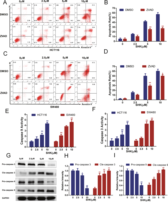Figure 2: Shikonin induces apoptosis in colon cancer cells in vitro. (A-B) Shikonin induced apoptosis in HCT116 cells. After the treatment of shikonin at different concentrations with or without the co-treatment of ZVAD (20 μM) for 24 h, cell death was observed by flow cytometry using PI and Annexin V staining. Quantification of the apoptosis rate of HCT116 cells is shown in (B). (C-D) Shikonin induced apoptosis in SW480 cells. Treatment was the same as that in (A). Quantification of the apoptosis rate of SW480 cells is shown in (D). (E-F) Colon cancer cells of HCT116 and SW480 were treated with shikonin for 24 h, and then caspase 9 and 3 activities of cell lysis were determined using assay kits. (G-I) Western blot analysis of caspase 3 and 9 detected the dose-dependent effect of shikonin acting on SW480 cells for 24 h. Assays were performed in triplicate. * < 0.05, ** < 0.01.