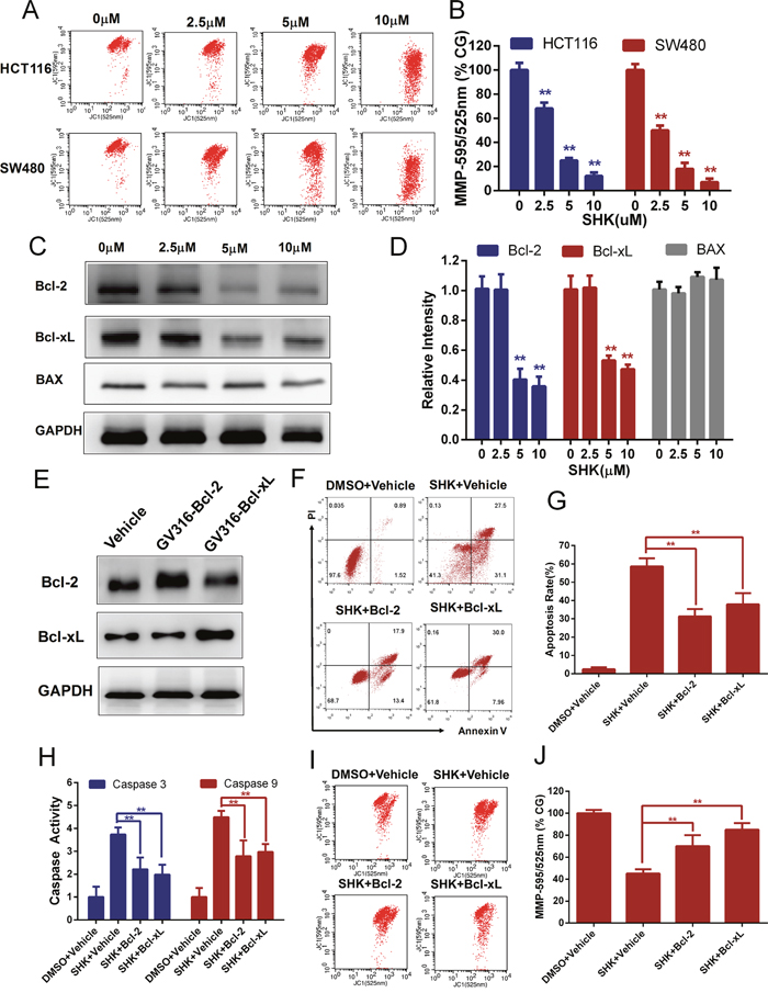 Figure 3: Shikonin-induced apoptosis in colon cancer cells is mitochondrial mediated. (A-B) Mitochondrial membrane potential (Δψ) analysis of HCT116 and SW480 cells to detect the dose-dependent effect of shikonin acting on mitochondrial dysfunction. The mitochondrial membrane potential was detected by flow cytometry using JC-1 probes 12 h after SHK treatment. CG indicates the control group. (C-D) Bcl-2, Bcl-xL and BAX expression in SW480 cells treated with shikonin for 24 h was analyzed by Western blot. GAPDH served as the loading control. (E) Western blot analysis of Bcl-2 and Bcl-xL to detect the overexpression effect of SW480 cells transiently transfected with overexpressing vectors (GV316). (F-G) Effects of Bcl-2 or Bcl-xL overexpression on shikonin-induced apoptosis in SW480 cells. Cells were treated with 5 μM shikonin for 24 h, and cell death was detected by flow cytometry using PI and annexin V staining. (H) Caspase 9 and 3 activity changes following Bcl-2 or Bcl-xL overexpression in SW480 cells. Cells were treated with 5 μM shikonin for 24 h, and caspase activities were determined by assay kits. (I-J) Mitochondrial membrane potential analysis of SW480 cells treated with 5 μM shikonin for 12 h after transient transfection with Bcl-2 or Bcl-xL. Assays were performed in triplicate. * < 0.05, ** < 0.01.