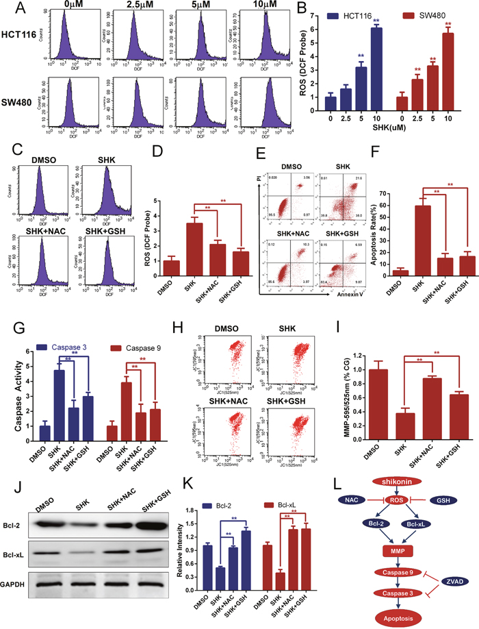 Figure 4: Shikonin induces apoptosis in colon cancer cells by the accumulation of intracellular ROS. (A-B) Intracellular ROS of HCT116 and SW480 cells was monitored by DCFH-DA probes to detect the dose-depended effect of shikonin treatment for 12 h. ROS was detected by flow cytometry. (C-D) ROS scavengers NAC (1 mM) and GSH (1 mM) were added to examine the influence of ROS accumulation induced by shikonin (5 μM) treatment for 12 h in SW480 cells. (E-F) Shikonin-induced apoptosis in SW480 cells was attenuated by ROS scavengers NAC (1 mM) and GSH (1 mM). Cells were treated with 5 μM shikonin for 24 h, and cell death was detected by flow cytometry using PI and Annexin V staining. (G) Caspase 3 and 9 activities were diminished by ROS scavengers NAC (1 mM) and GSH (1 mM) in SW480 cells treated with 5 μM shikonin for 24 h. (H-I) Mitochondrial membrane potential analysis of SW480 cells co-treated with 5 μM shikonin and ROS scavengers NAC (1 mM) or GSH (1 mM) for 12 h. The mitochondrial membrane potential was detected by flow cytometry using JC-1 probes, and CG indicates the control group. (J-K) Bcl-2 and Bcl-xL expression of SW480 cells treated with 5 μM shikonin and ROS scavengers NAC (1 mM) or GSH (1 mM) for 24 h was analyzed by Western blot. GAPDH served as loading control. (L) Pathway of SHK-induced apoptotic cell death in colon cancer cells.