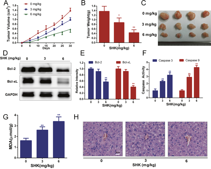 Figure 5: Shikonin exerts anticancer activities and induces the apoptosis of xenografts in vivo. (A) The tumor volume of xenografts was measured every 5 days after the transplantation of SW480 cancer cells in nude mice. (B) Tumor weight of xenografts after treatment with shikonin (0, 3, 6 mg/kg body weight) for 30 days. (C) Tumor pictures of xenografts treated with shikonin. (D-E) Bcl-2 and Bcl-xL expression of xenografts after treatment with shikonin for 30 days was analyzed by Western blot. GAPDH served as the loading control. (F) Caspase 3 and 9 activities of xenografts were determined by assay kits. (G) The MDA content indicated that lipid peroxidation was detected. (H) Histological toxicity analysis of the liver (200×, Scale bars: 20 μm) in nude mice by hematoxylin and eosin staining after shikonin treatment (0, 3, 6 mg/kg body weight).