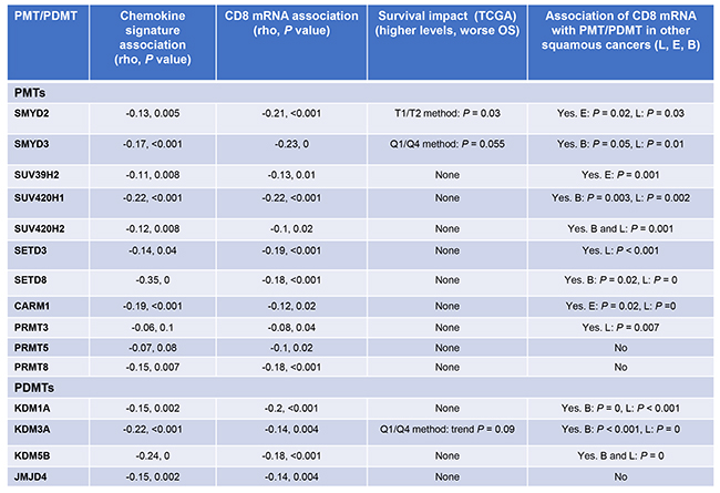 Figure 1: PMTs/PDMTs that are negatively correlated with the mean chemokine signature scores and CD8 mRNA. Pearson’s correlation coefficients were calculated, and correlations were considered significant if P < 0.05. Overall survival in SCCHN and associations of PMT/PDMT with CD8 mRNA in lung squamous, esophageal squamous and bladder carcinoma are also shown. Correlations were performed using the TCGA mRNA database. Overall survival analysis was performed with the Kaplan-Meier method (median, quartile or percentile) using the TCGA mRNA database for SCCHN, lung, esophageal squamous and bladder carcinoma. PMT: protein methyltransferase, PDMT: protein demethylase, OS: overall survival, L: lung squamous, E: esophageal squamous, B: bladder.