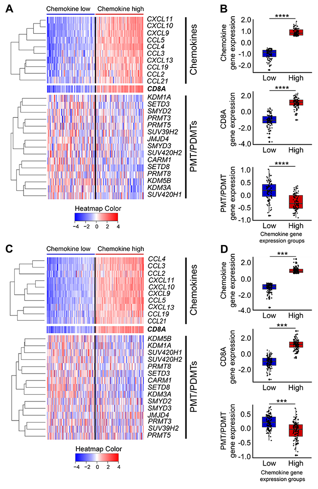 Figure 2: Heatmap of 15 candidate PMTs/PDMTs with the chemokine signature in the TCGA database for HPV-negative SCCHN and lung squamous cell carcinoma. Heatmaps were generated using the normalized and log2-transformed RNA-seq gene expression data. (A-B) HPV-negative SCCHN. (A) Panel A, top: Expression heatmap of the 10 chemokine genes (left to right: samples were sorted by median chemokine gene expression, lower to higher). Panel A, middle: Expression heatmap of CD8A (same sample order as the chemokine gene heatmap). Panel A, bottom: Expression heatmap of the 15 PMT/PDMT genes (same sample order as the chemokine gene heatmap). (B) Box plot showing the expression of chemokines, CD8A and PMT/PDMT genes in the T-cell inflamed and non-T-cell inflamed groups, indicated by low and high chemokine gene expression, respectively, which highly correlates with CD8A+ gene expression. Top to bottom: Box plot showing the median chemokine gene expression, CD8A gene expression, and median PMT/PDMT gene expression in the two tumor groups (**** P < 0.0001). (C-D) Lung squamous cell carcinoma. As per panels (A-B). (*** P < 0.001).