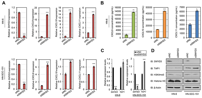 Figure 4: SMYD3 knockdown induces the expression of CD8+ T-cell attracting chemokines and antigen processing machinery molecules in SCCHN cells. (A-B) Induction of CXCL9, CXCL10 and CXCL11 mRNA transcripts and protein levels upon SMYD3 knockdown in SCCHN cell lines. HN-6 and HN-SCC-151 cells were transfected with a control siRNA (siNC) and a SMYD3-specifc siRNA (siSMYD3) for a period of 72 hours. 24 hours prior to collection, cells were exposed to 1000U/mL of IFN-β. (A) SMYD3 knockdown resulted in significant upregulation of CXCL9, CXCL10 and CXCL11 mRNA levels in HN-6 and HN-SCC-151 cells assessed by real-time PCR. (***P < 0.001). mRNA levels were normalized by GAPDH. (B) Effect of SMYD3 knockdown on IFN-β-mediated release of CXCL9, CXCL10 and CXCL11 chemokines in SCCHN cells. Supernatants collected from HN-6 cells were further assayed for CXCL9, CXCL10 and CXCL11 protein levels by ELISA. Cells treated with siSMYD3 showed increased protein levels of CXCL9, CXCL10 and CXCL11 production compared to siNC treated cells. (*P < 0.05; **P < 0.01; ***P < 0.001). (C-D) Induction of TAP1 mRNA transcripts and protein levels upon SMYD3 knockdown in SCCHN cell lines. HN-6 and HN-SCC-151 cells were transfected with a control siRNA (siNC) and a SMYD3-specifc siRNA (siSMYD3) for a period of 72 hours. 24 hours prior to collection, cells were exposed to 1000U/mL of IFN-β. (C) Real-time PCR demonstrates upregulation of TAP1 after SMYD3 knockdown (same samples as in (A)) (*P < 0.05; ***P < 0.001). mRNA levels were normalized by GAPDH. (D) Western blotting of nuclear (SMYD3, H3K4me3) and cytoplasmic (TAP1) extracts shows an increase in TAP1 protein levels and attenuation of H3K4me3 levels upon SMYD3 knockdown.
