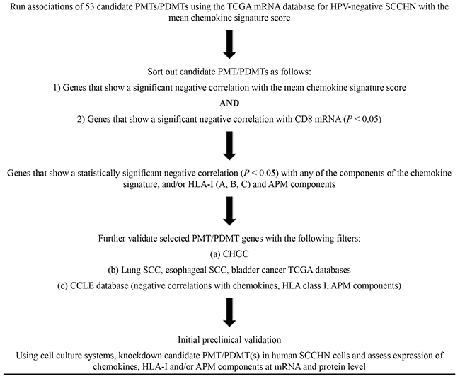 Given that the mRNA from these databases is derived not only from tumor cells but also immune stromal cells, and our hypothesis is that PMT/PDMTs driving CD8+ T-cell exclusion are produced by cancer cells, we sought to further validate negative correlations between the selected PMT/PDMT genes and chemokines, HLA class I and/or APM components in the Cancer Cell Line Encyclopedia mRNA database using SCCHN, lung squamous and esophageal squamous cancer cell lines with available mRNA expression data. Table 2 shows a flow chart of the methodology used to sort out promising PMT/PDMTs for further preclinical investigation.