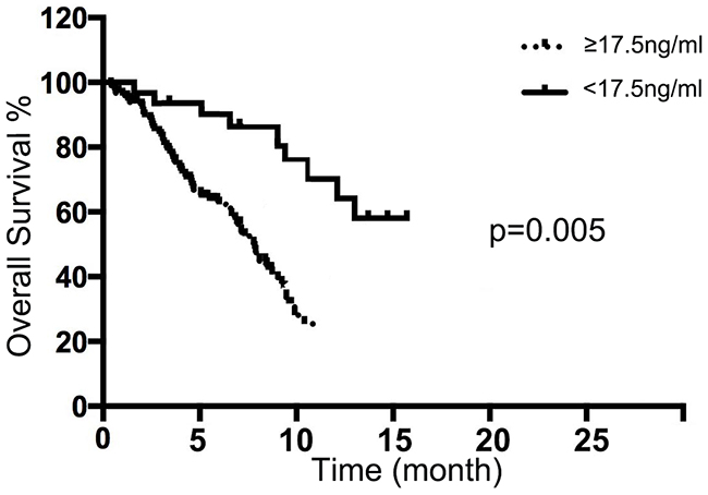 Figure 3: Pleural fluid MAC30 expression with overall survival of NSCLC patients. The NSCLC patients with high MAC30 expression had a significantly worse outcome compared with the patients with low MAC30 level (p = 0.005).