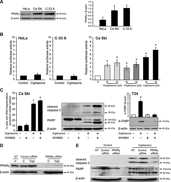 Figure 2: PPARγ-independent effects of ciglitazone in Ca Ski cells. (A) Western blot analysis of PPARγ expression in HeLa, Ca Ski and C-33 A cervical cancer cell lines. (B) Luciferase activity in cells cotransfected with Cyp2XPal-luc firefly and Renilla luciferase reporter genes as described in Materials and methods and treated for 12 h with 40 μM ciglitazone (HeLa, C-33 A), 10 or 40 μM rosiglitazone, pioglitazone or ciglitazone (Ca Ski). (C) Ca Ski cells were treated for 12 h by 40 μM ciglitazone alone or in combination with 80 μM GW9662, an irreversible potent inhibitor of PPARγ. Left, the percentage of cells showing hypodiploid DNA content (sub-G1 peak) was evaluated by flow cytometry analysis; middle, after treatment, whole cell lysates were prepared and total protein extracts were subjected to immunoblotting for detection of procaspase 3 and PARP processing; right, positive control : GW9662 blocking action on the ciglitazone-mediated expression of the A-FABP (PPARγ target gene). β-actin was used as an internal loading control. (D, E) Effect of PPARγ knockdown on ciglitazone-induced Ca Ski cell apoptosis. Cells were transfected with PPARγ siRNA or non-targeting siRNA and treated or not with 40 μM ciglitazone. PPARγ expression as well as procaspase 3 and PARP processing were analysed by western blotting from whole cell protein extracts. Data are means ± SEM of three independent experiments performed in triplicates. *P < 0.05 compared to untreated cells.