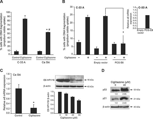 Figure 4: Ciglitazone-mediated Ca Ski cell apoptosis is associated with E6 downregulation. (A) C-33 A and Ca Ski cells were treated or not with 40 μM ciglitazone for 12 h. The percentage of cells showing hypodiploid DNA content (sub-G1 peak) was evaluated by flow cytometry analysis. *P < 0.05 compared to control cells. #P < 0.05 compared to C-33 A cells treated with ciglitazone. (B) C-33 A cells were transfected or not with empty vector or with pCG-E6 construct and stimulated with 40 μM ciglitazone for 12 h. The percentage of cells in sub-G1 was evaluated by flow cytometry analysis; insert, RTqPCR expression analysis of e6 transcript levels confirming the efficiency of the pCG-E6 plasmid transfection. *P < 0.05 compared to empty vector-transfected cells treated with ciglitazone. (C) left, RTqPCR expression analysis of e6 transcript levels in Ca Ski cells treated or not with 40 μM ciglitazone for 12 h; right, western blot of E6 level with β-actin as an internal loading control and densitometric analysis. *P < 0.05 compared to control cells. (D) Immunoblotting analysis for p53 and p21 expression. β-actin was used as an internal loading control. Values of densitometric analyses are indicated.