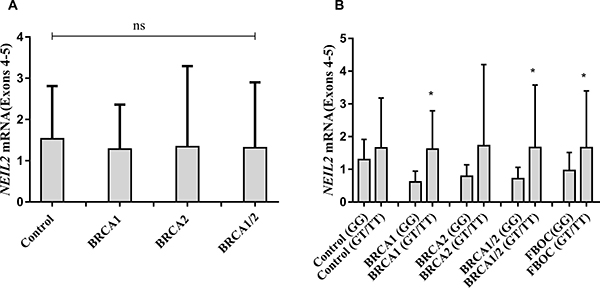 Figure 1: (A) Comparative analysis of NEIL2 mRNA expression according BRCA mutational status in FBOC series (BRCA1 and BRCA2 mutation carriers are compared with Controls). (B) Comparative analysis of NEIL2 mRNA expression according the SNP status ((Carriers (GT/TT) Vs Non-carriers (GG)) among the different FBOC groups (BRCA1, BRCA2 mutation carriers and BRCA1/BRCA2 non-carrier Controls). Bars represent the mean and the standard deviation for each group. Unpaired student t test was used to test for potential significant differences between means. (*p < 0.05).